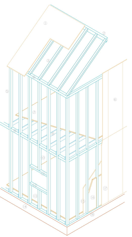 Alba.L. (2019-2020). Constructive axonometric of Balloon Frame system. Constructive analysis of current modular architecture intended for single-family homes.
