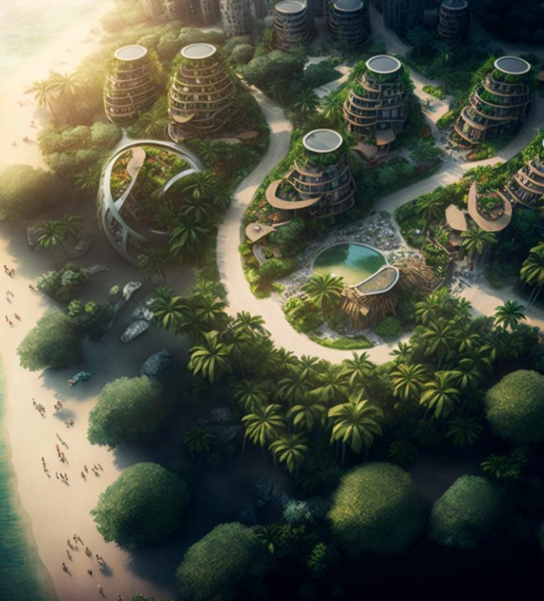 Smart City designed through A.I. specifically for human beings through culture, recreational spaces and a mix of uses between the city and industry.