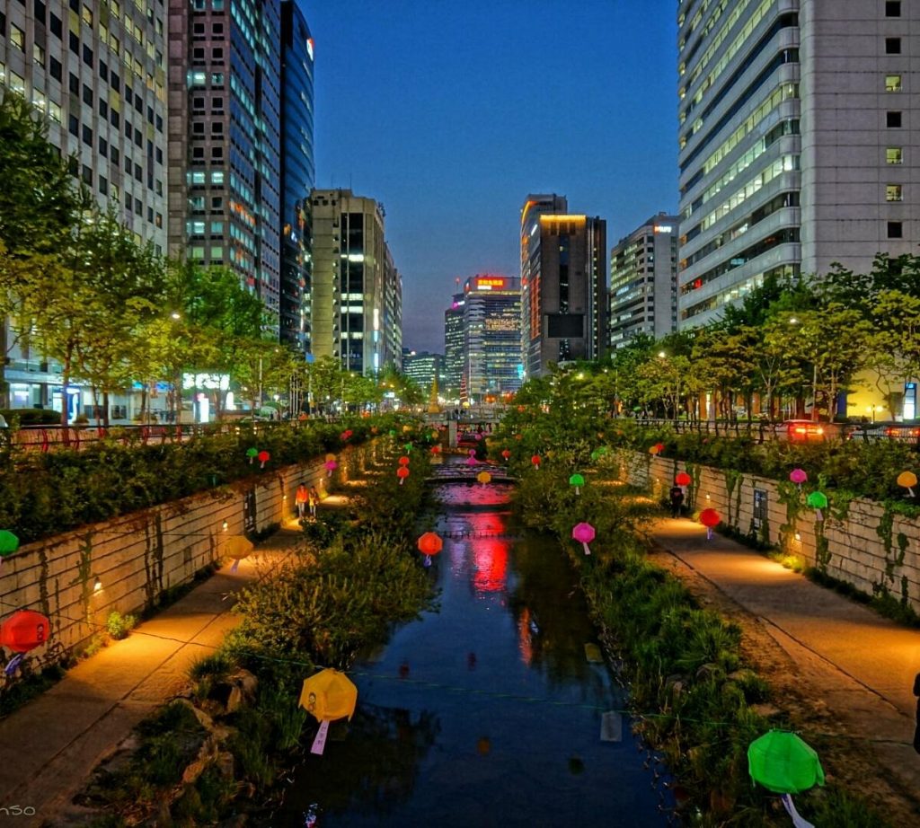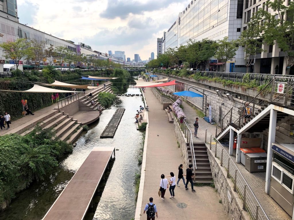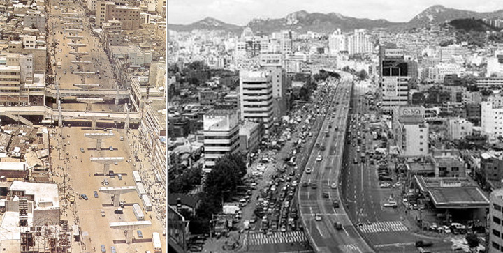 En la década de 1950, un importante flujo de inmigrantes dio lugar a la invasión de asentamientos informales a lo largo de las riberas del río Cheonggyecheon. Utilizado como alcantarilla, el río pasó a estar gravemente contaminado y ser propenso a las inundaciones. En 1958, el río fue cubierto con hormigón y, a principios de 1970, se construyó sobre él una autopista de 16 metros de ancho.