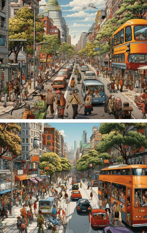 Imágenes creadas con I.A. para ejemplificar “La importancia del transeúnte en las ciudades” por Cafeína Design