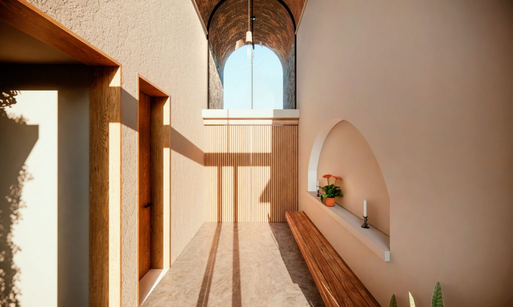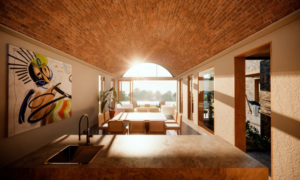 The layout of the house revolves around a central courtyard, a common feature in Mexican haciendas that provides natural light, cross ventilation, and a focal point around which different spaces are organized. The choice of materials is essential to achieve the desired aesthetics and environmental sustainability. Traditional materials such as local stone, concrete, and wood are used in combination with modern thermal insulation and energy-efficient technologies to ensure maximum thermal comfort in all seasons.