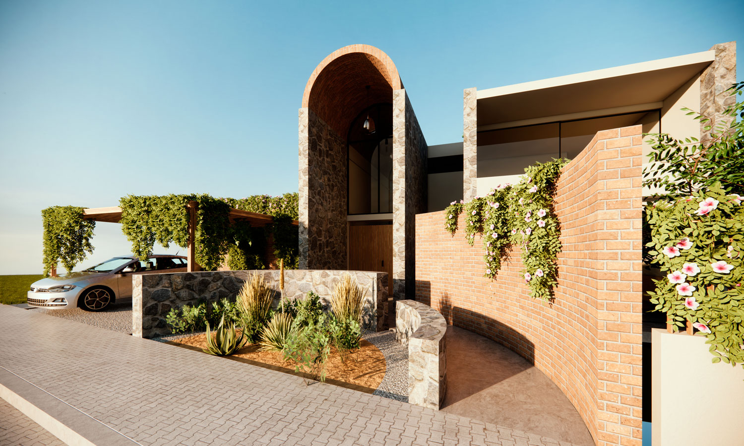 The residence is designed for a young couple who share a deep appreciation for Mexican architecture and traditional haciendas, as well as a desire to live in harmony with the surrounding nature. The main goal of the design is to evoke iconic elements of Mexican architecture, reinterpreting its forms and concepts from a deeper and more meaningful perspective.